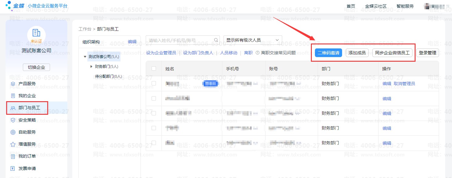 在工作台左边的【部门与员工】,有三种邀请方式:【添加成员】、【二维码邀请】、【同步企业微信员工】(企业微信开通的服务可通过该方式同步子账号)如图:
