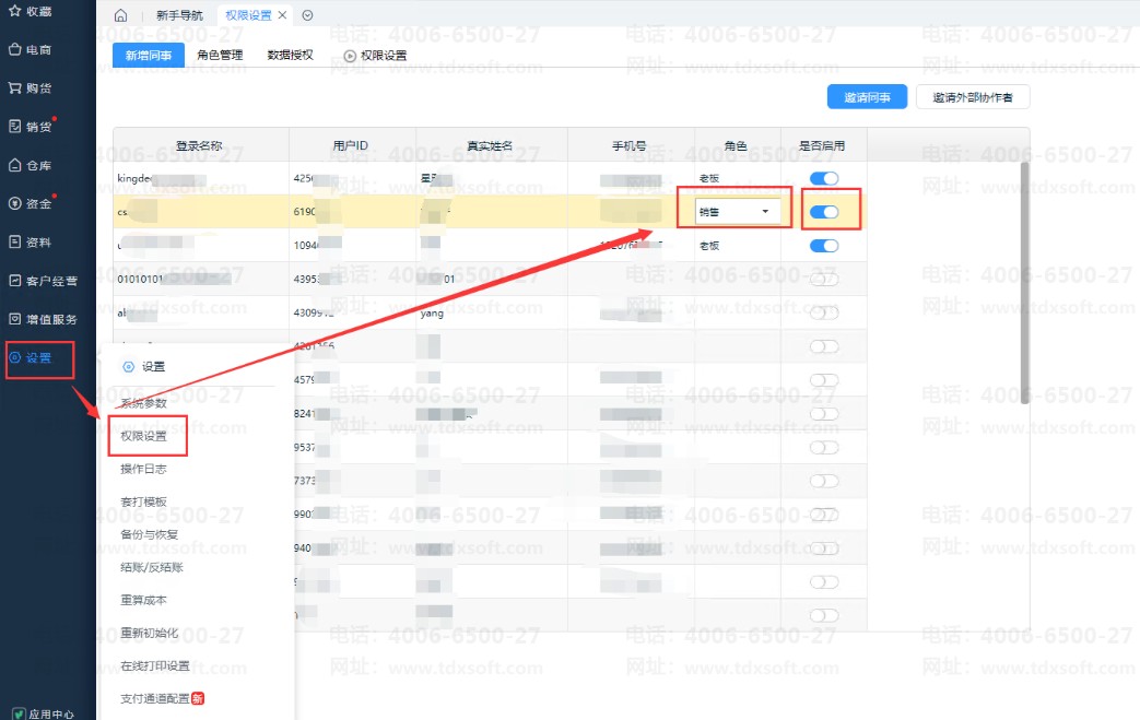 使用服务管理员账号登录系统,点击【进入使用】进入产品后,点击左下角【设置】-【权限设置】进入授权页面;勾选新同事,点击【启用】并选择对应的【角色】,选择什么角色就拥有对应权限。如下图所示: