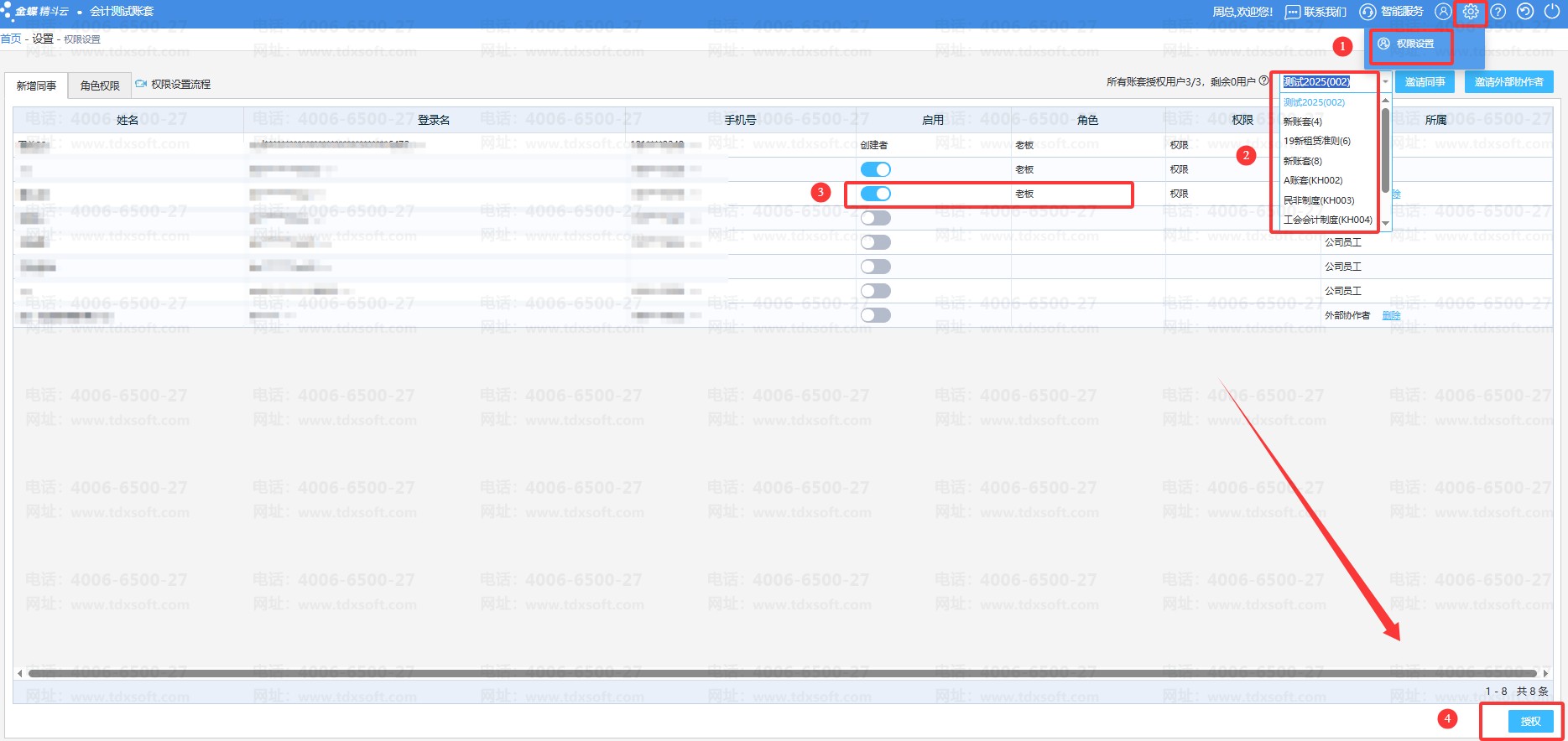 ①进入权限设置,②选择授权的账套,③启用角色,④点击【授权】。
