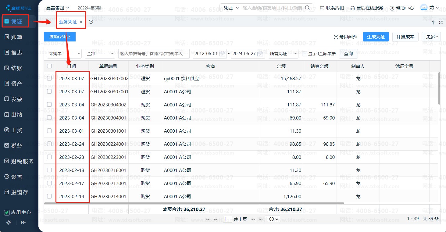 目前业务凭证界面的单据是根据单据日期的降序来进行排序的,不支持根据单据日期和单据编号进行调整排序