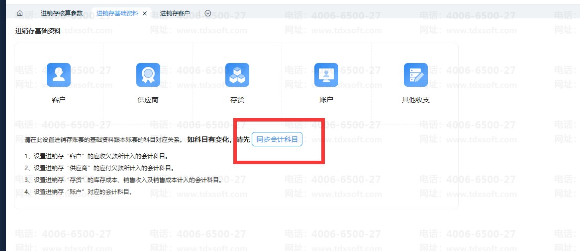 设置好对应科目后,返回【进销存基础资料】界面,点击【同步会计科目】