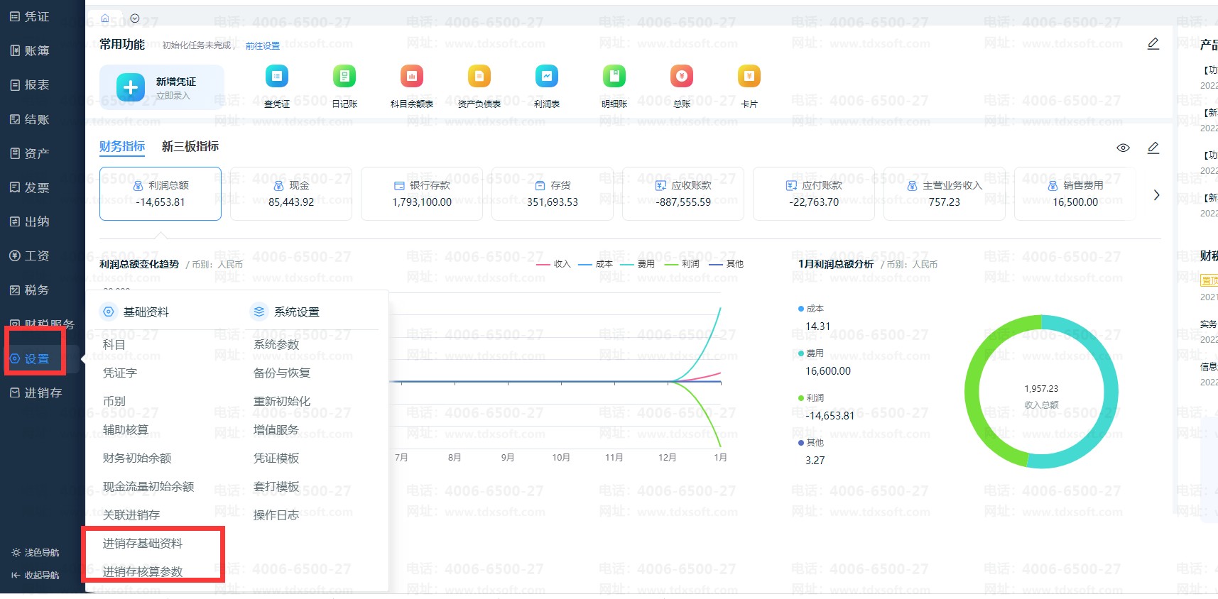 点击【设置】-【进销存基础资料】,可设置进销存基础资料对应的科目