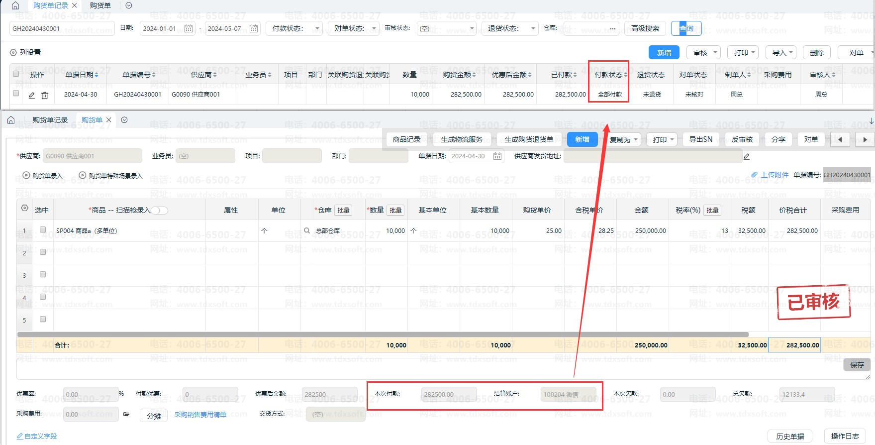 1、若采购同时付款,直接在购货单下方的【本次付款】、【结算账户】录入付款账户和金额,则购货单状态为【全部付款】状态。不需要另外录入付款单。