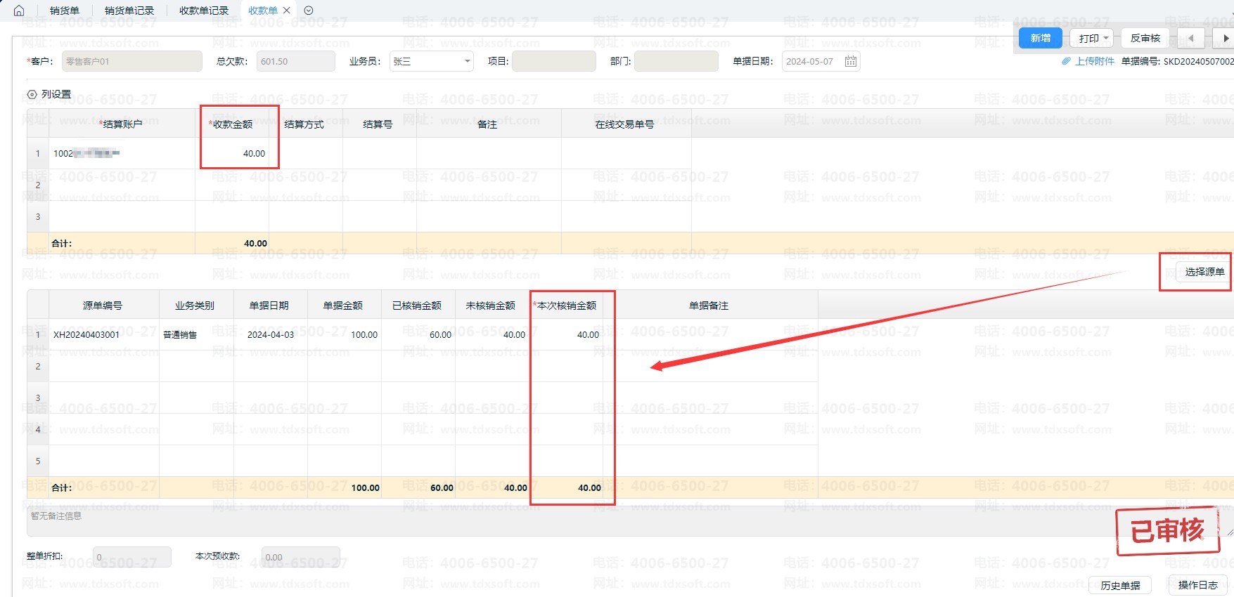 2、若销售时没有收款,保存/审核销货单后直接生成应收账款。后续可通过在【资金】-【收款单】-【选择原单】进行核销核销,冲抵应收账款。