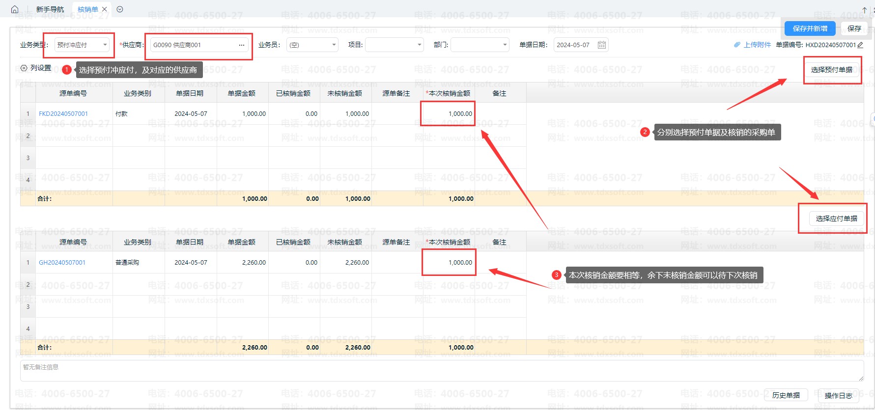 3、可以部分核销,若余下未核销的应付款,可以通过付款单支付(即付款单支付尾款)
