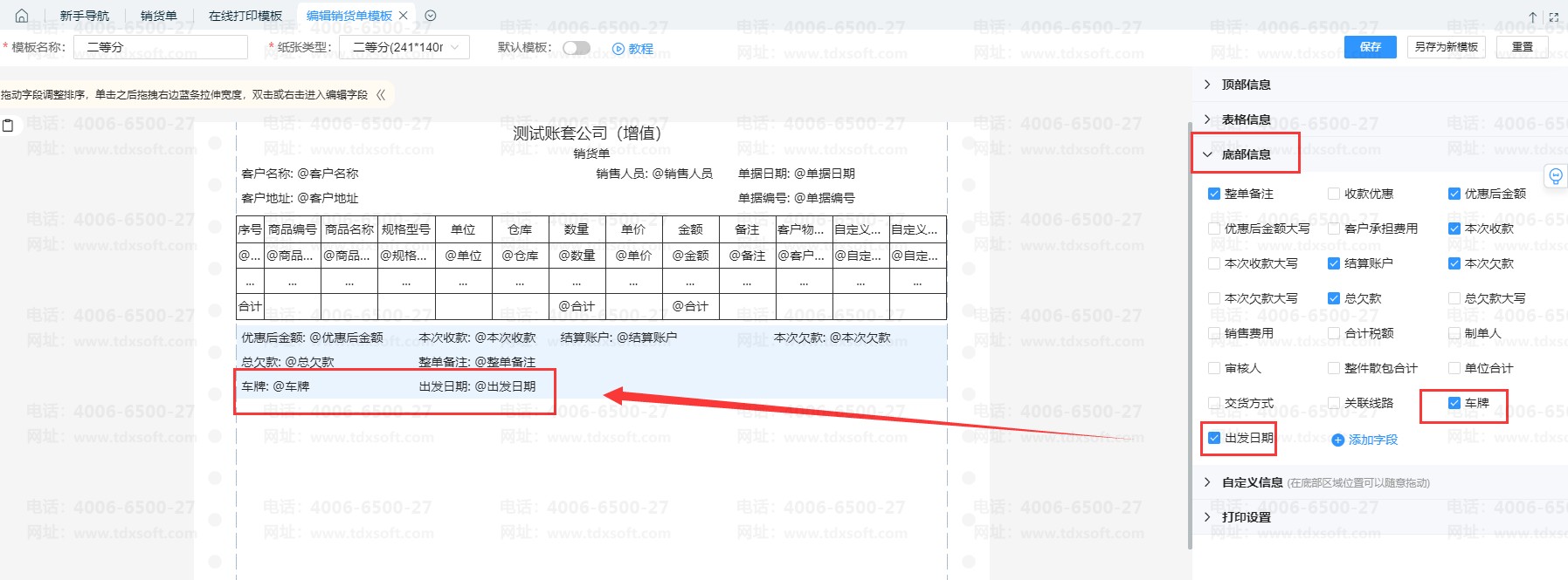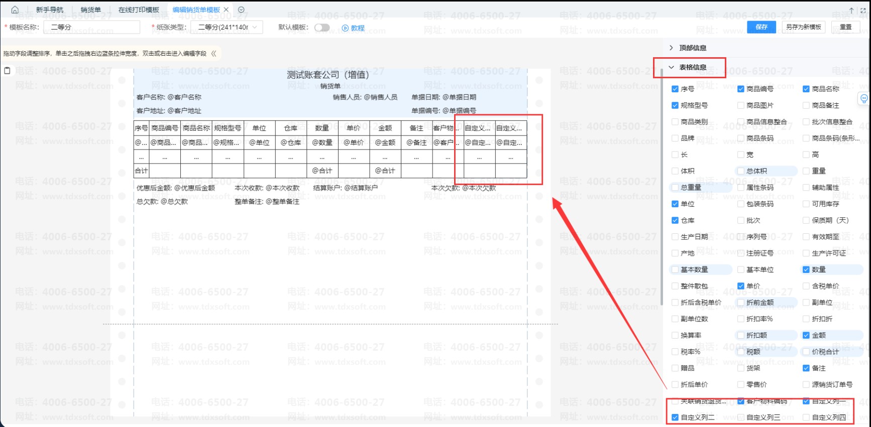 3、打印方式 :单据支持打印自定义列,在打印模板直接勾选对应的自定义列即可。
