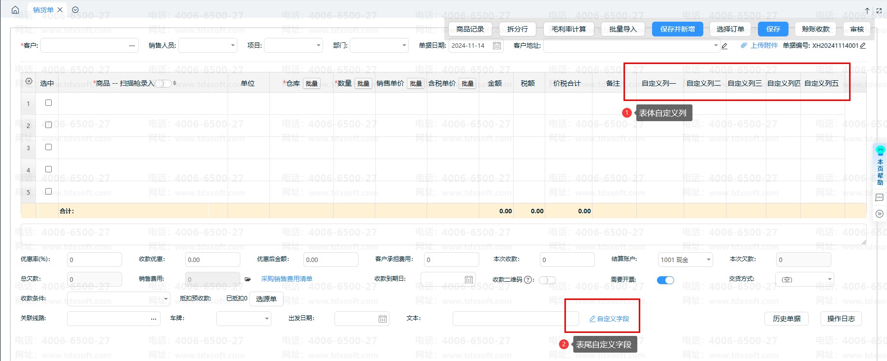 ①表体自定义列预置五个字段,不支持直接新增自定义字段。