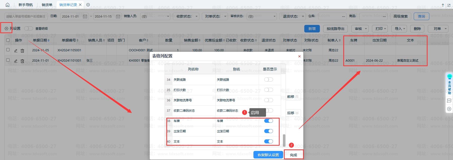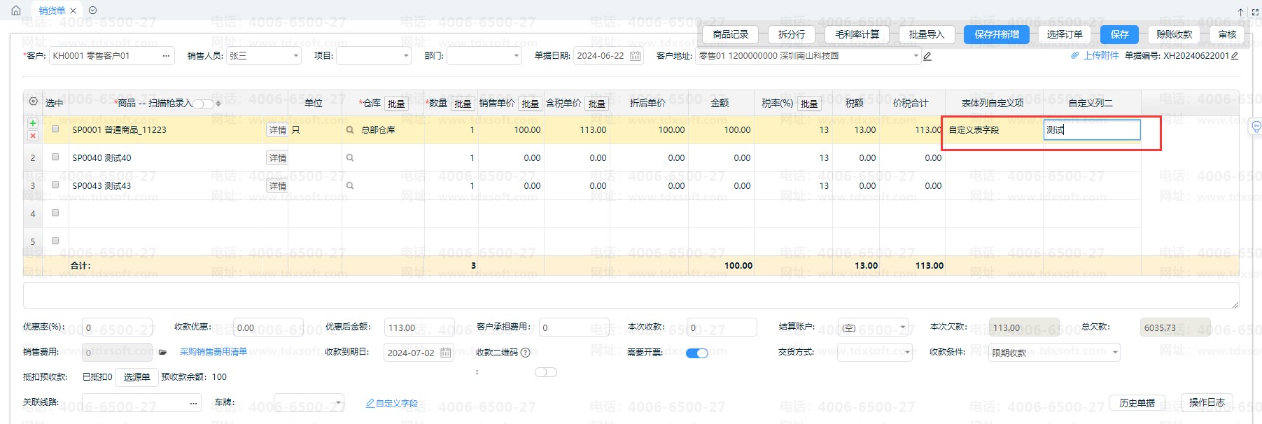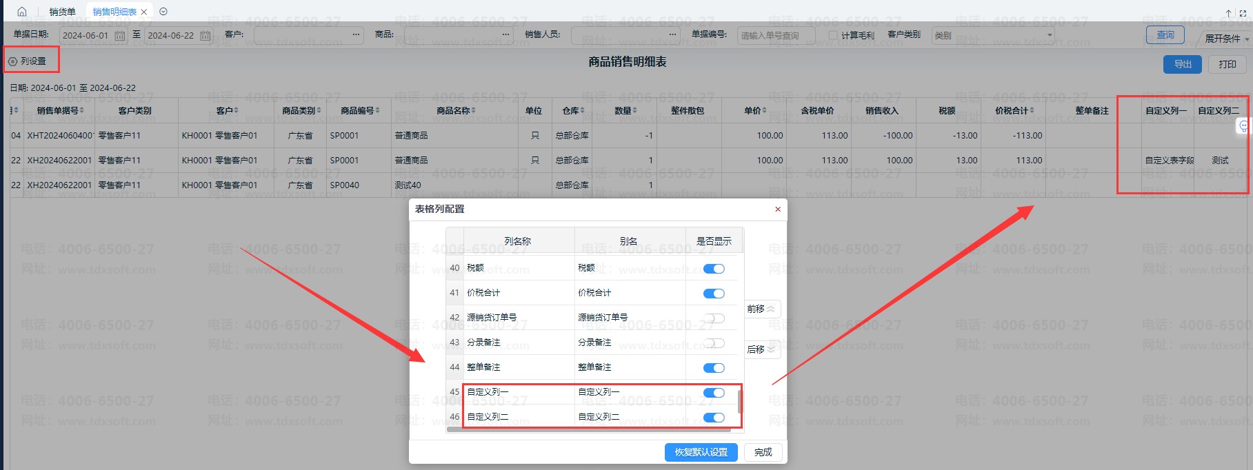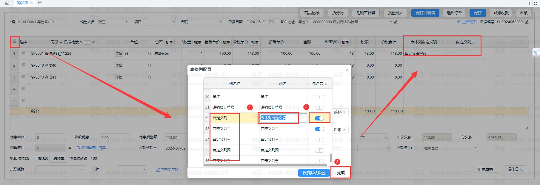系统预置五个自定义列,直接列设置启用,即可录入内容;后续销售报表可显示自定义列信息。