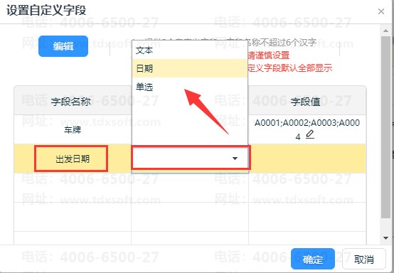 如添加“出发日期”,字段类型选择【日期】,最后点击【确定】