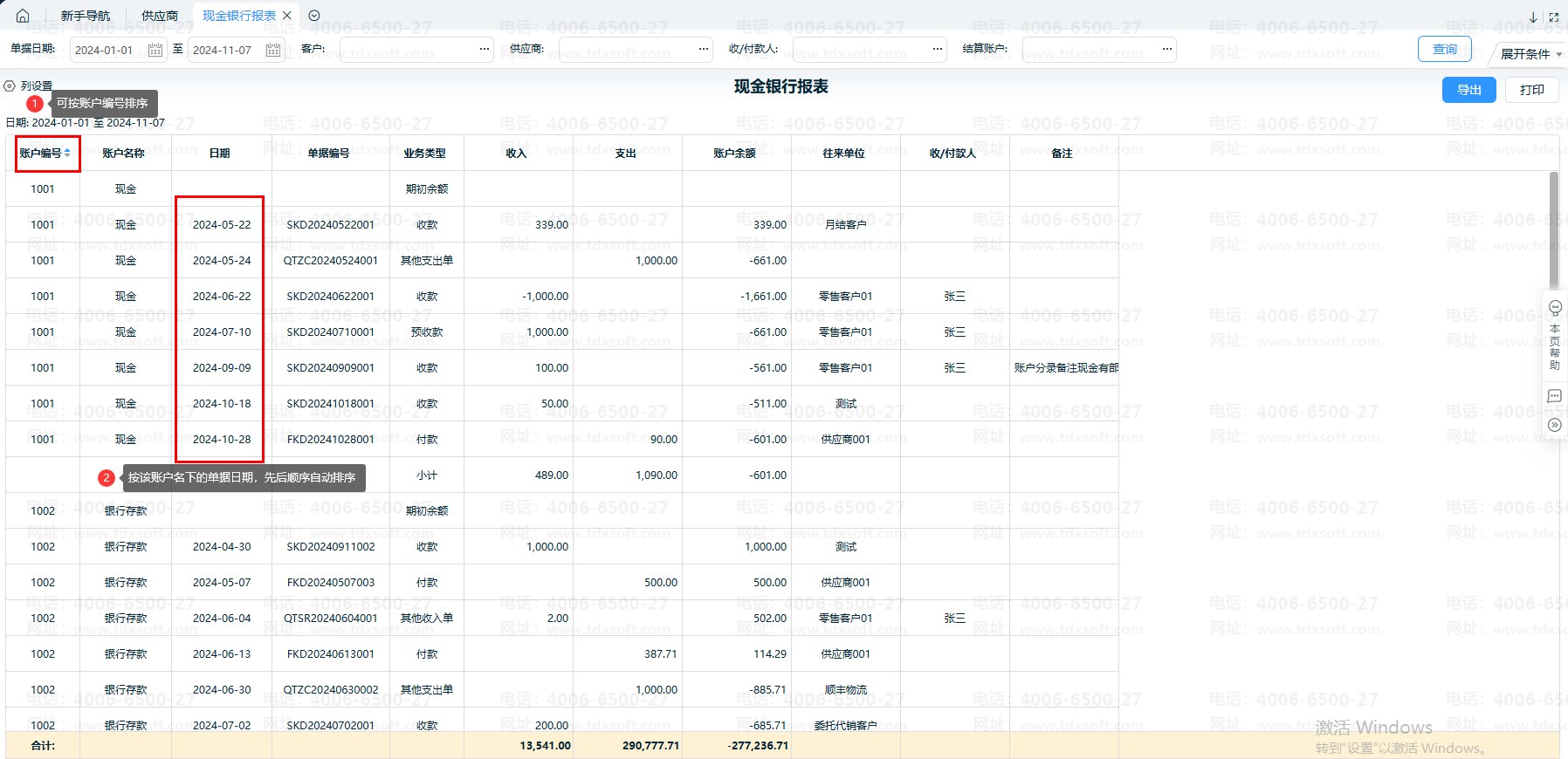 2、目前现金银行报表可以按【账户编号】进行升序降序。默认按该账户名下的单据的日期先后顺序,自动排序。
