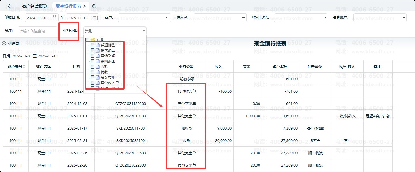 ②支持按单据的业务类型查询筛选。如“普通销售”即现收的销货单,“收款”即收款单,“其他收入单”即现收的其他收入单等。