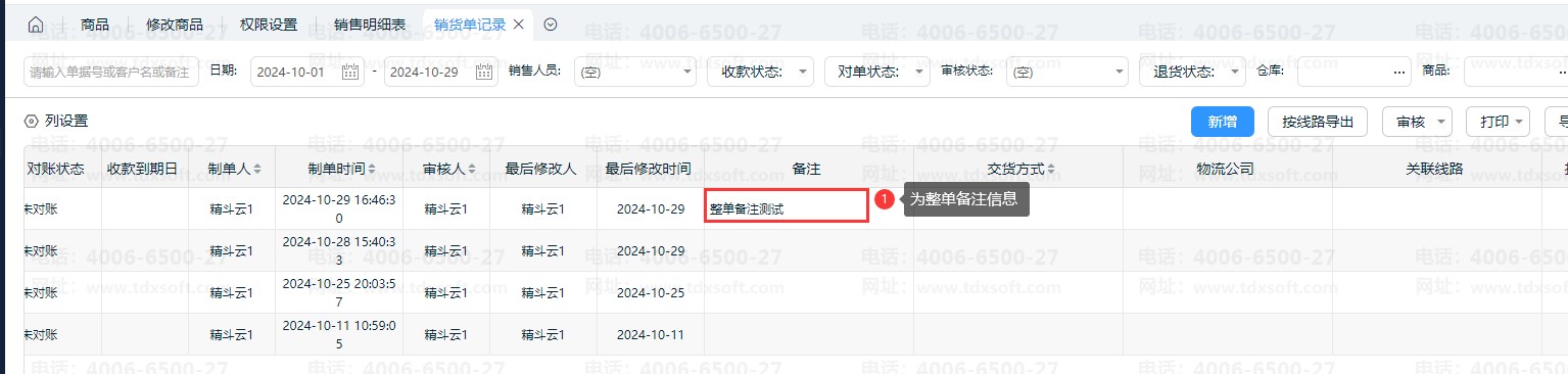 ①在单据记录(单据列表)界面,直接显示“整单备注”。