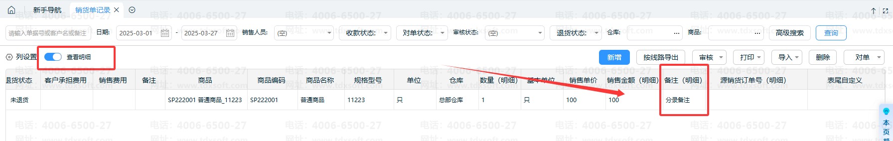 ②销售类单据,在单据记录(单据列表)可启用【查看明细】,显示“备注(明细)”即单据中的分录备注内容。