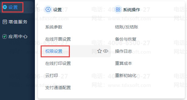 请登录账套管理员的账号,进入进销存系统,依次点击【设置】-【权限设置】