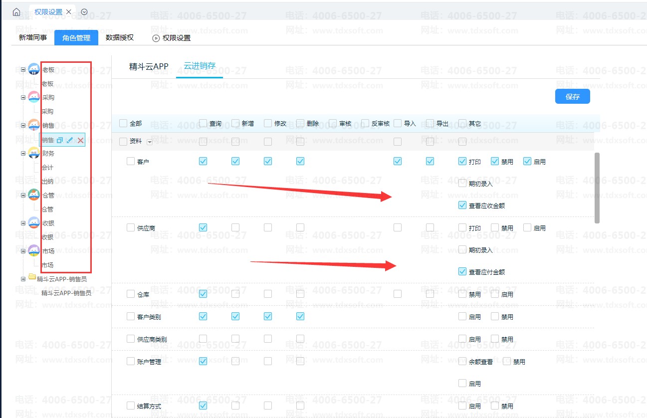 在【角色管理】-【资料】-【客户】/【供应商】勾选【查看应收金额】和【查看应付余额】权限项,最后记得点右上角【保存】按钮。,