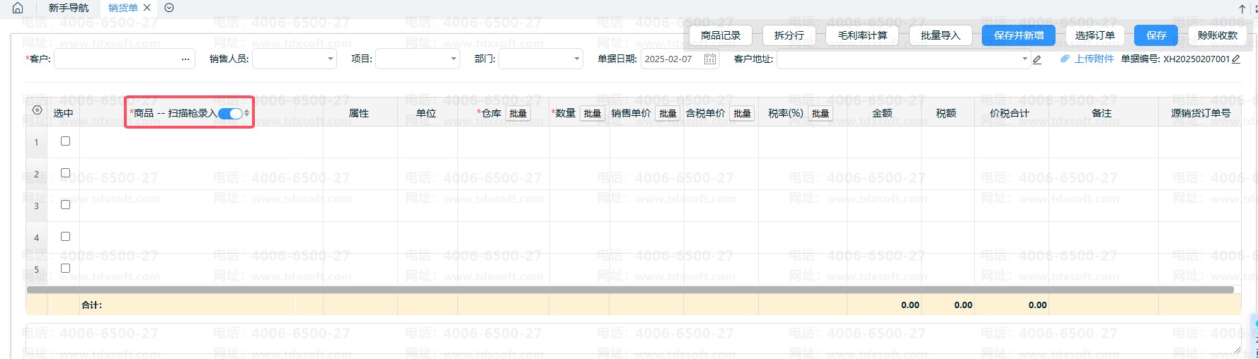 2、单据编辑界面,启用【商品-扫码枪录入】按钮。用扫码枪扫描商品条码,可自动带出对应商品,不需手工录入。