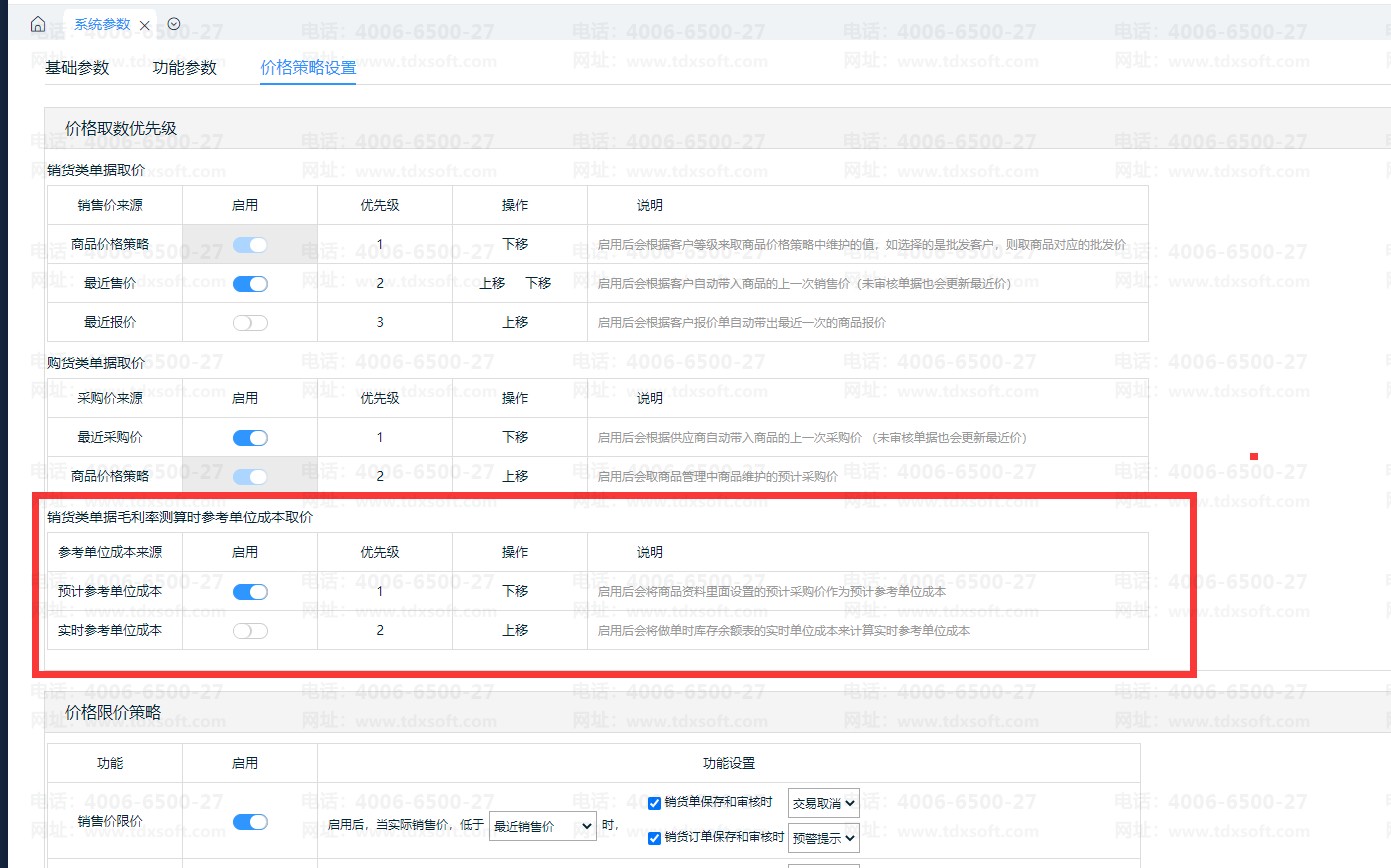 2、找到“销货类单据毛利率测算时参考单位成本取价”,可启用想要的参考成本来源参数