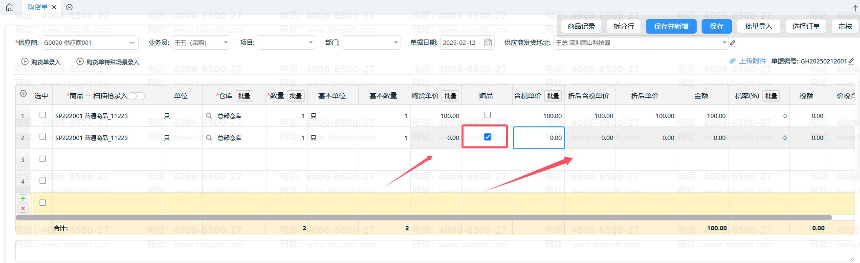 参考“销售环节”在录入购货单时,列设置启用【赠品】字段;并在商品行,勾选赠品选项即可。同样,涉及到金额栏目默认为0,且无法编辑修改。