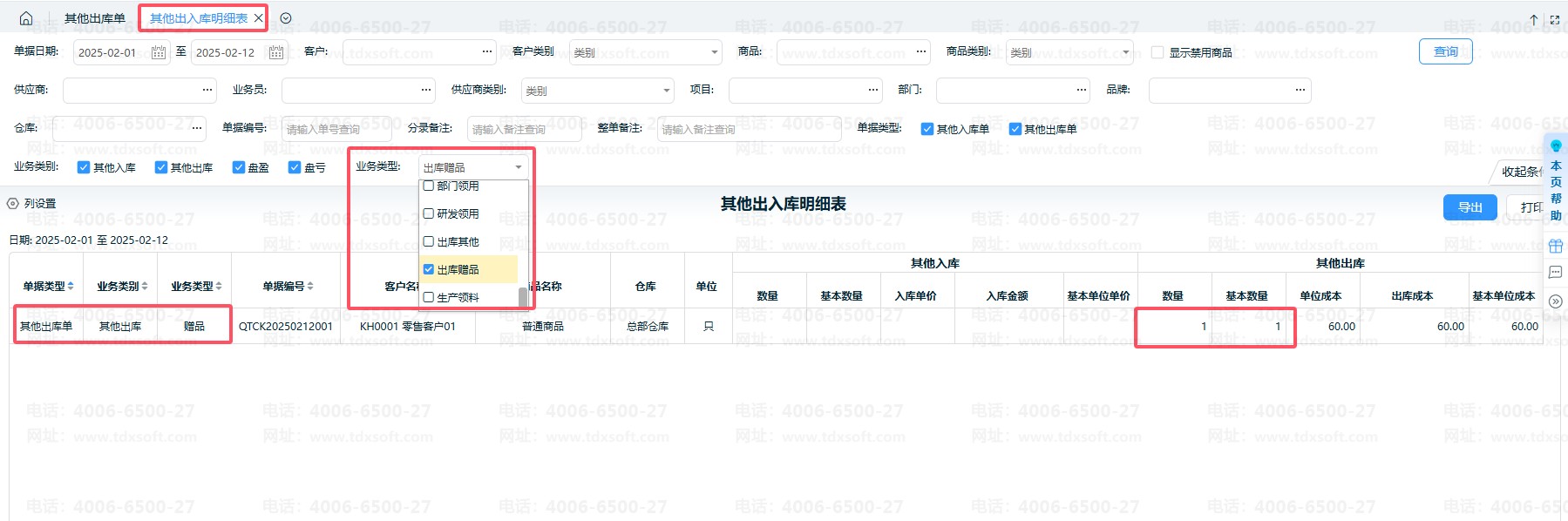 后续可通过【仓库】-【其他出入库明细表】,按“业务类型-出库赠品”筛选条件统计赠送商品数据。