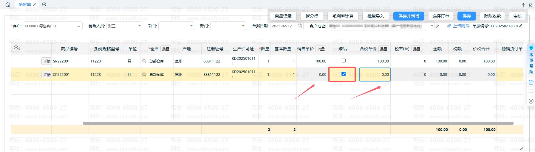 接着选择赠品,勾选赠品选项。涉及到金额栏目默认为0,且无法编辑修改。