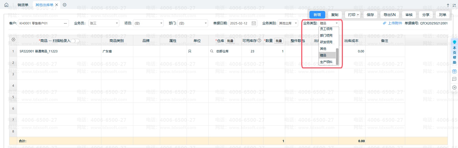 新增其他出库单,业务类型选择【赠品】,其他出库不涉及到单价金额无需录入。