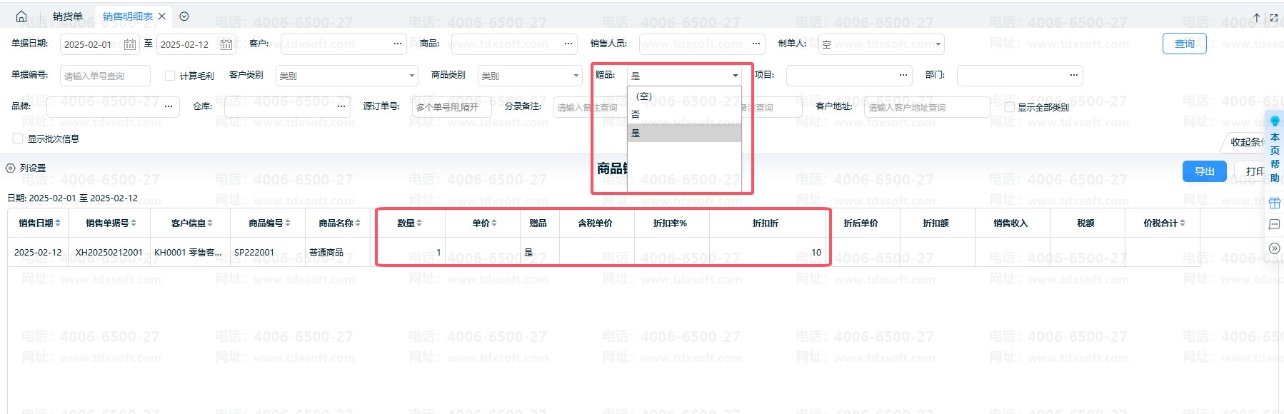 后续可通过【销货】-【销售明细表】,按“赠品”筛选条件统计赠送商品数据。