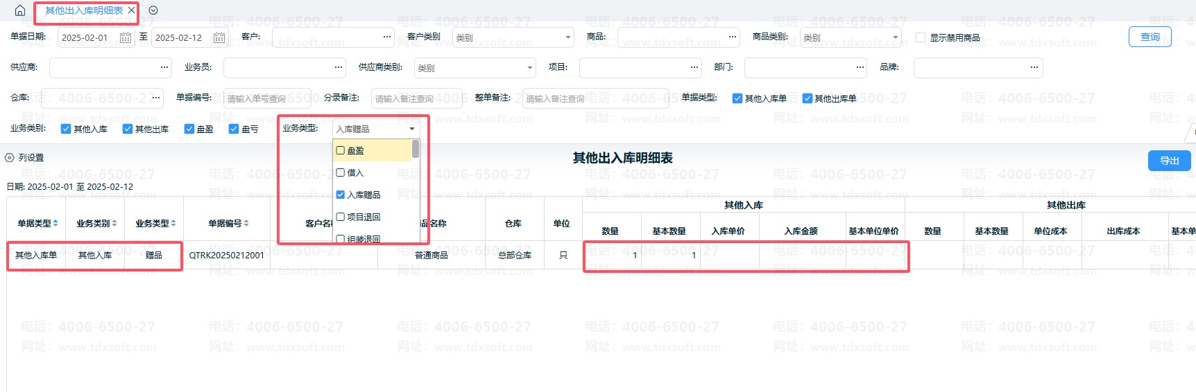 后续可通过【仓库】-【其他出入库明细表】,按“业务类型-入库赠品”筛选条件统计赠送商品数据。