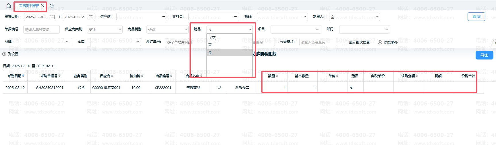 后续可通过【购货】-【采购明细表】,按“赠品”筛选条件统计赠送商品数据。