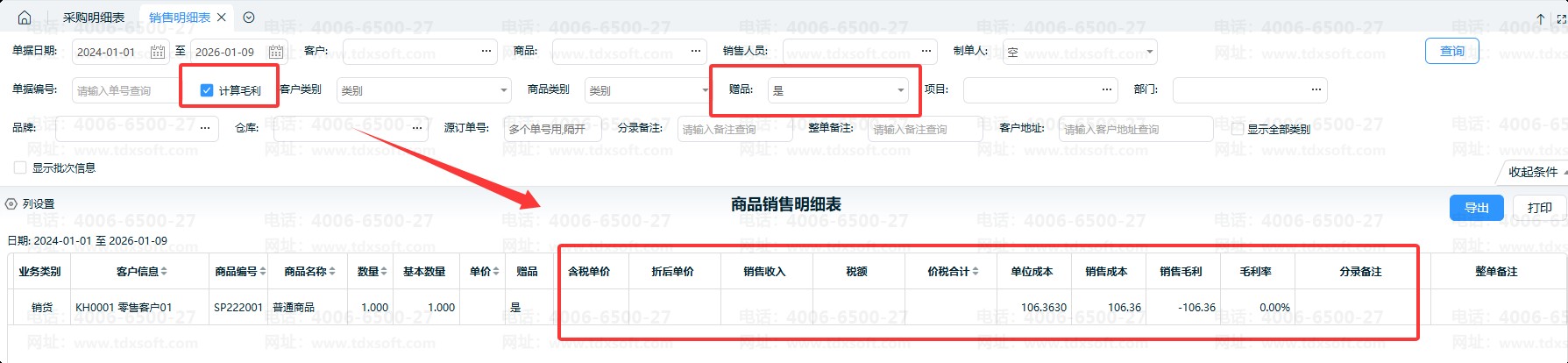 可通过销售明细表、采购明细表,查询及统计赠品信息。