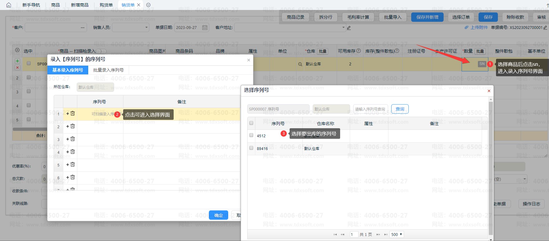③编辑销货单、其他出库单等出库类单据,选择序列号的商品,只能选择仓库中已有的序列号进行出库(同样支持扫描枪)