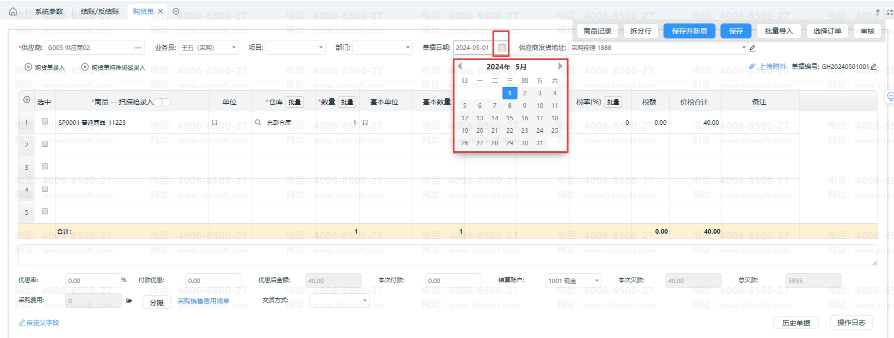 2、系统启用日期以后日期的单据,可以补录,若单据日期是未结账期间,新增单据时,直接选择日期即。