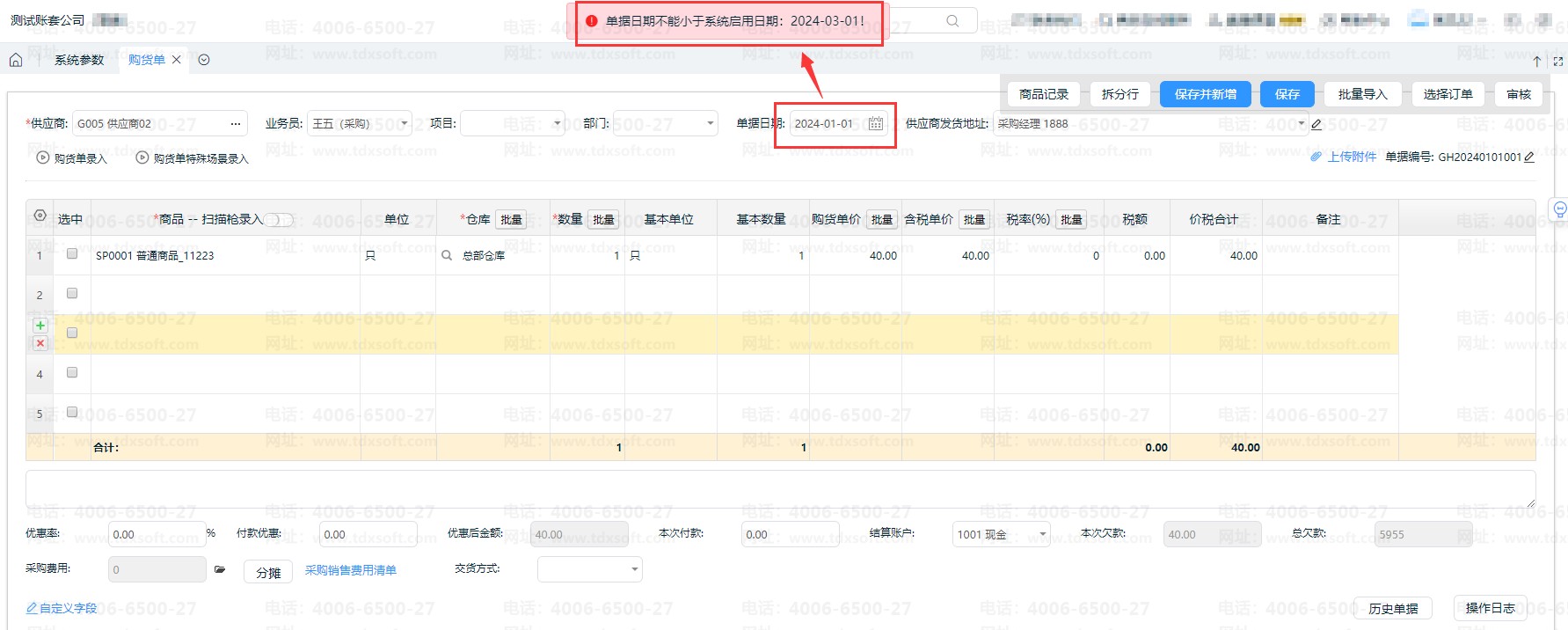 1、系统启用日期之前的单据,不支持补录,系统会提示单据日期小于启用期间。