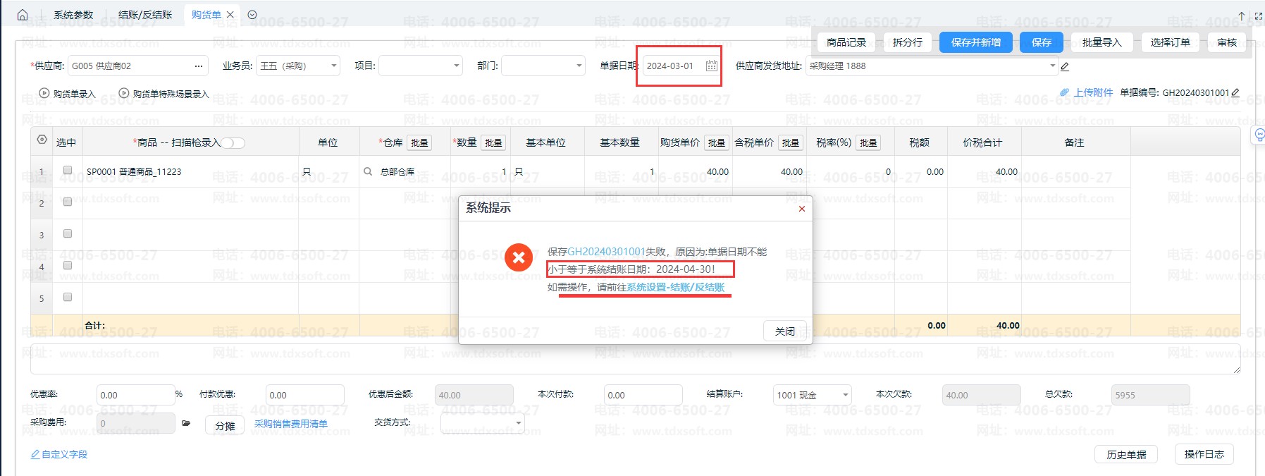 按提示,在【系统设置】-【结账/反结账】反结账回到3月份之前,再补录结账前的单据