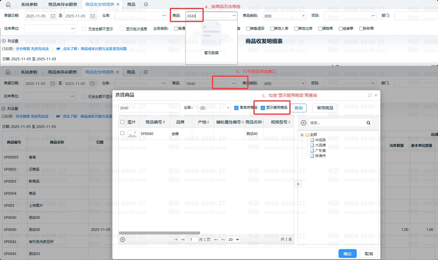 ③可按商品、商品类别查询。注意:若在“商品”栏中无法筛选商品,请检查该商品是否已被禁用,可打开商品筛选窗口,勾选“显示禁用商品”重新查询。