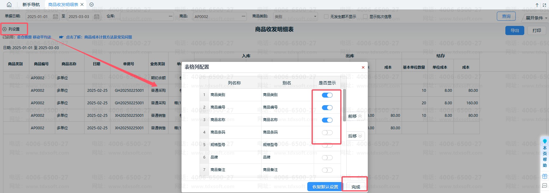 ⑨若报表部分字段未显示出来,可通过左上角【列设置】显示