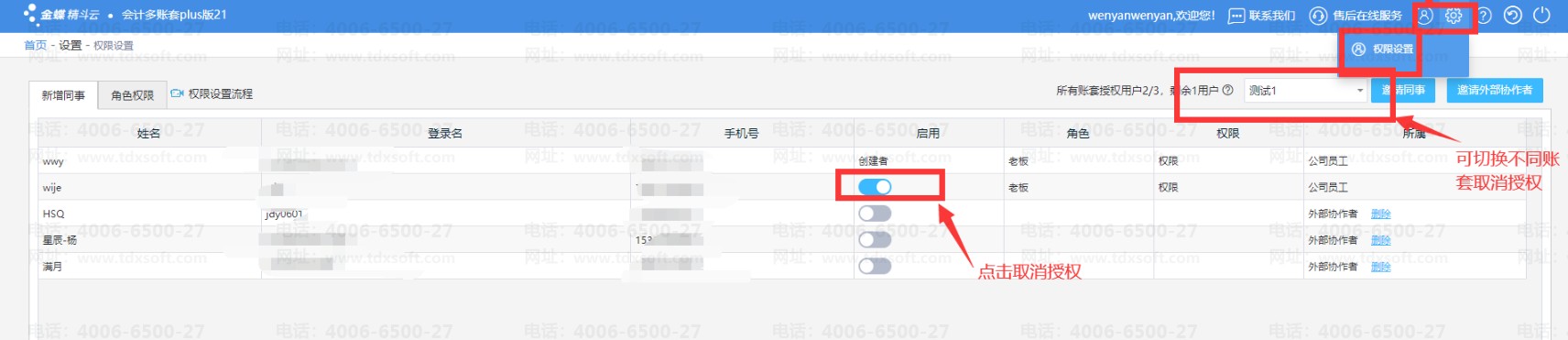 ④取消子账号的授权后,该账号在原账套中已录入的数据不受影响并继续保留;但,该账号将无法进入原账套进行查询及操作。