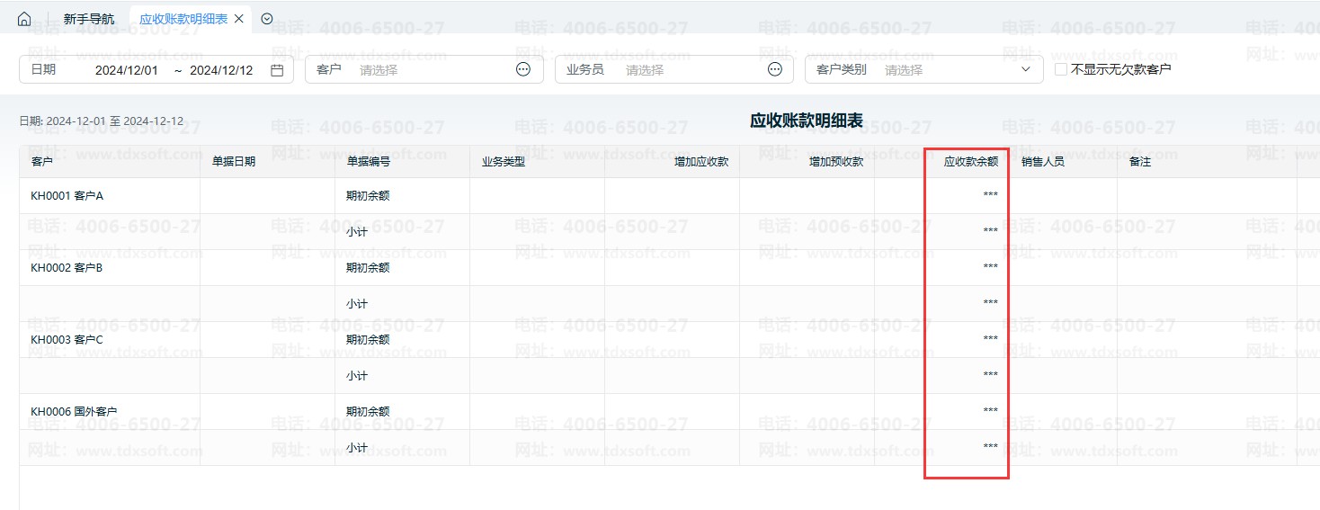 若是未勾选【查看应收余额】或【查看应付余额】,往来报表不会显示应收款余额或应付款余额。如图所示: