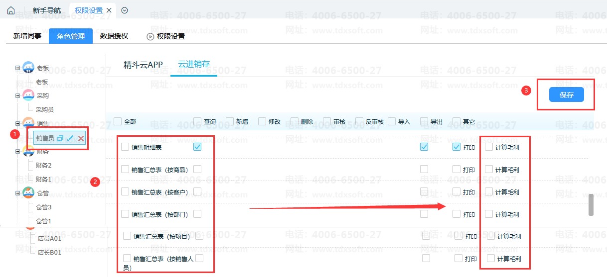 在【设置】-【权限设置】-【角色管理】,选择子账号对应的角色,如“销售员”
