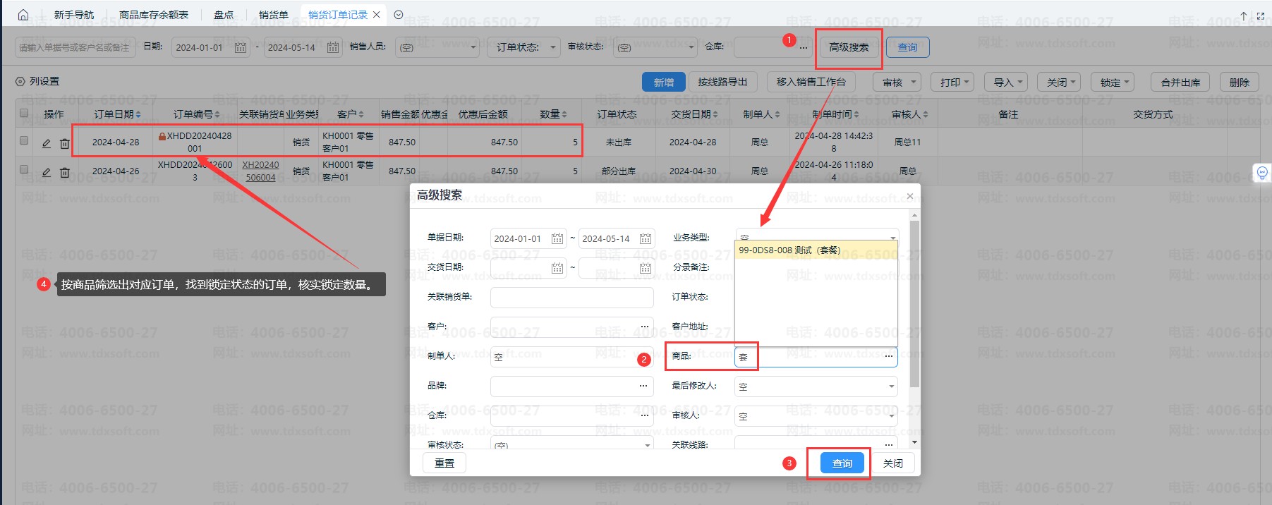 在销货订单列表-【高级搜索】按商品查询出对应的订单,找到锁定状态未出库的订单,核实其锁定数量。
