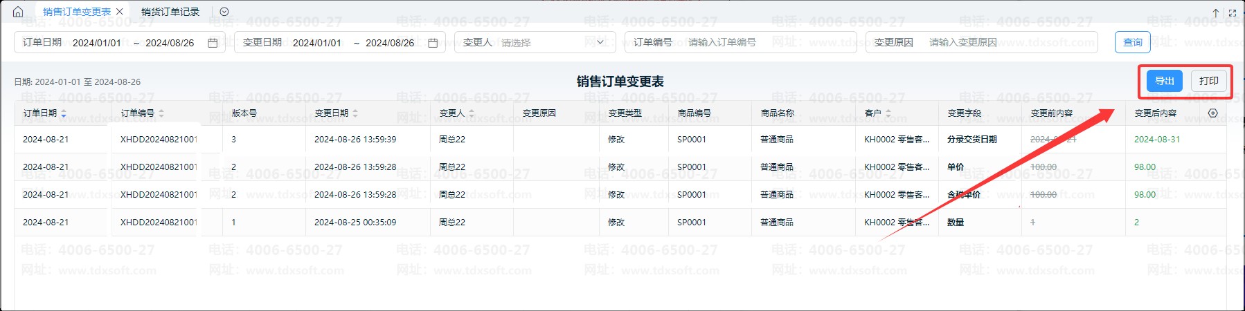 查询出订单变更表后,可直点击右上角【打印】或【导出】按钮,进行打印或导出对应内容。