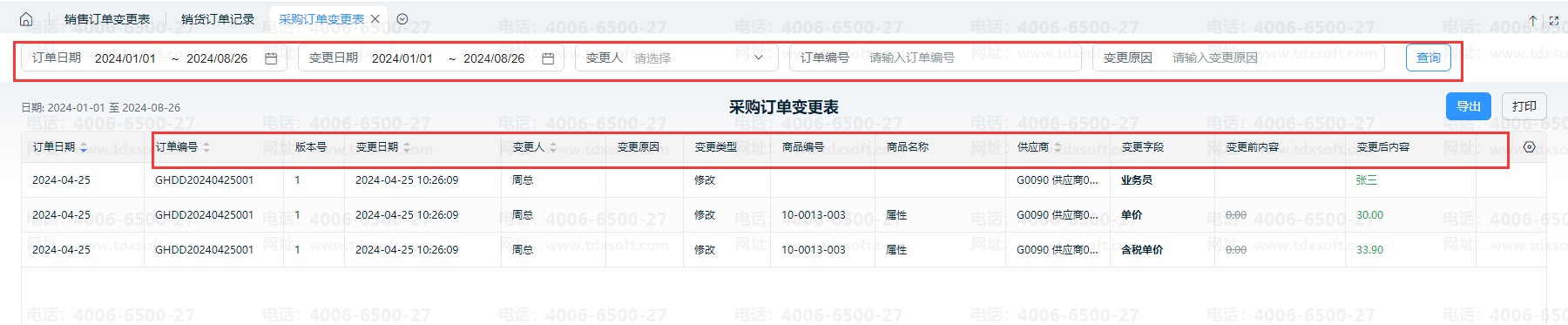 在购货订单和销货订单进行变更操作后,可分别通过采购订单变更表和销售订变更表查询所有订单的变更记录及变更详情,并将查询的内容打印或导出。
