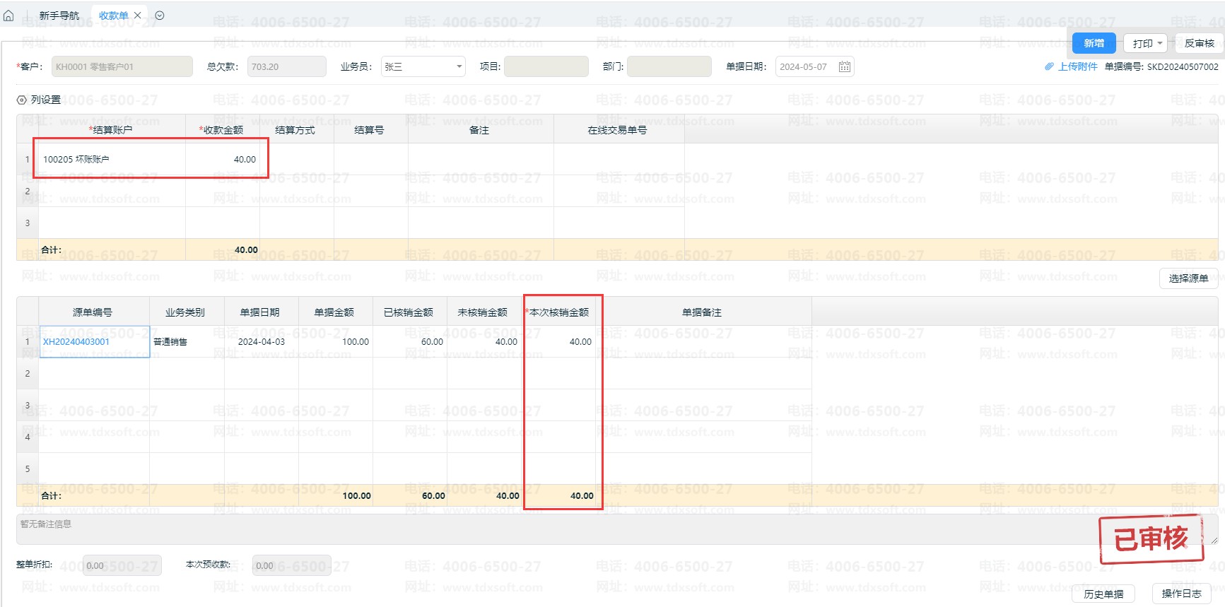 ①新增【收款单】,选择对应的销货单源单,在【整单折扣】填上此单坏账金额,如图所示,销货单的应收余额40元不再收取,做为整单折扣录入40元。
