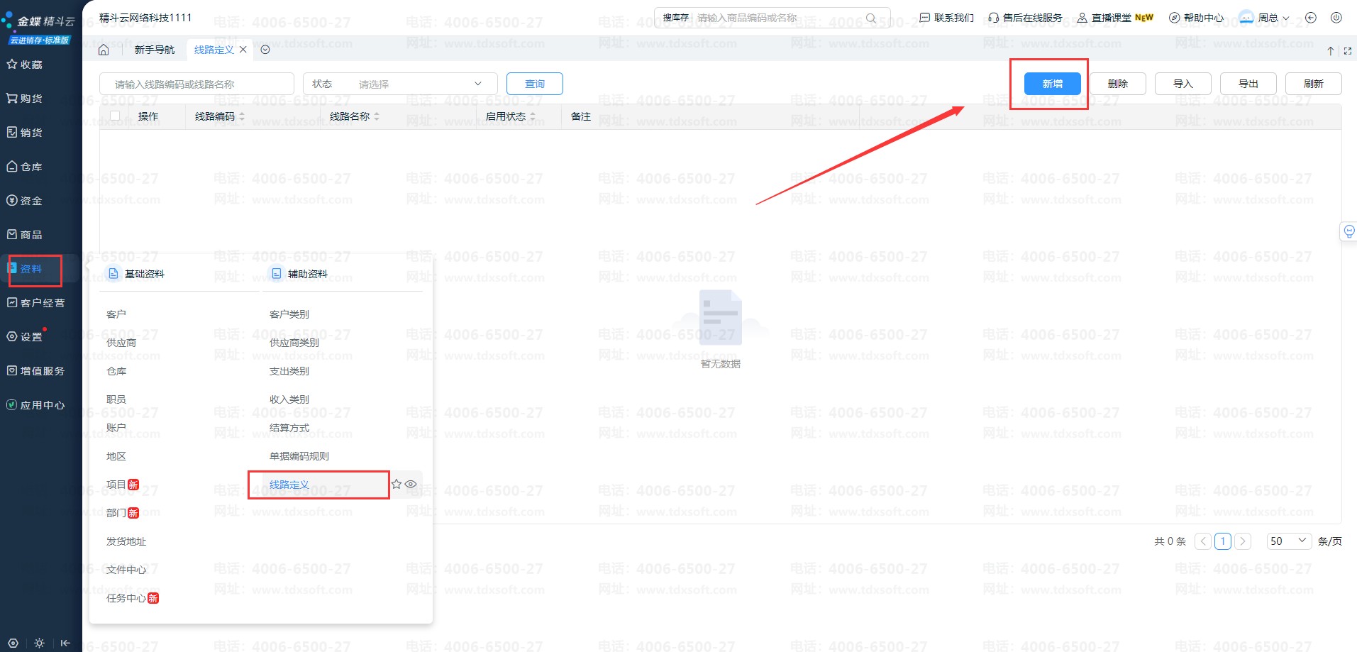 依次点击【资料】-【线路定义】在线路定义界面点击右上角【新增】,设置“线路编码”及“线路名称”等再点击【保存】