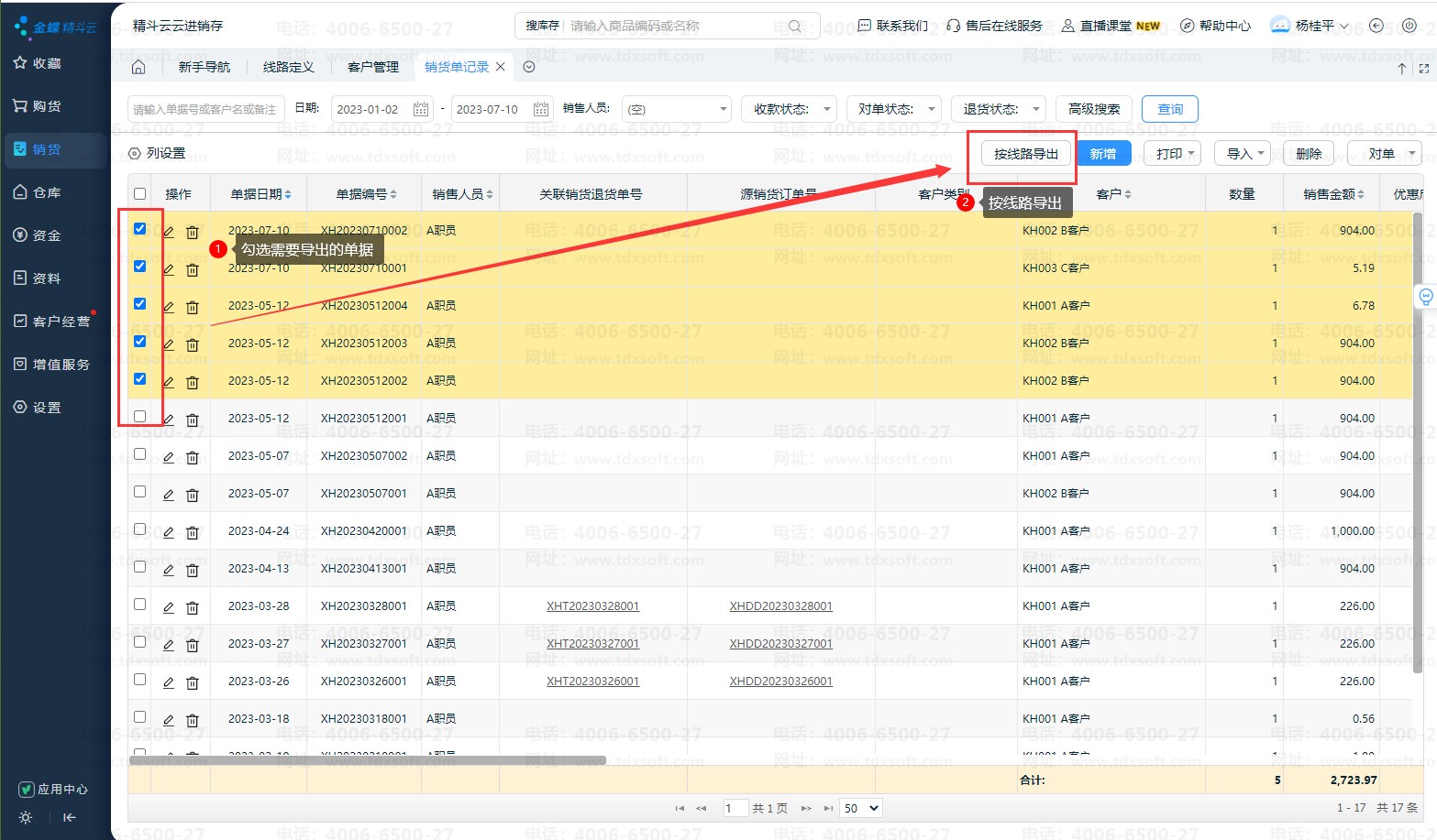 销货单记录中的“按线路导出”功能如何使用?