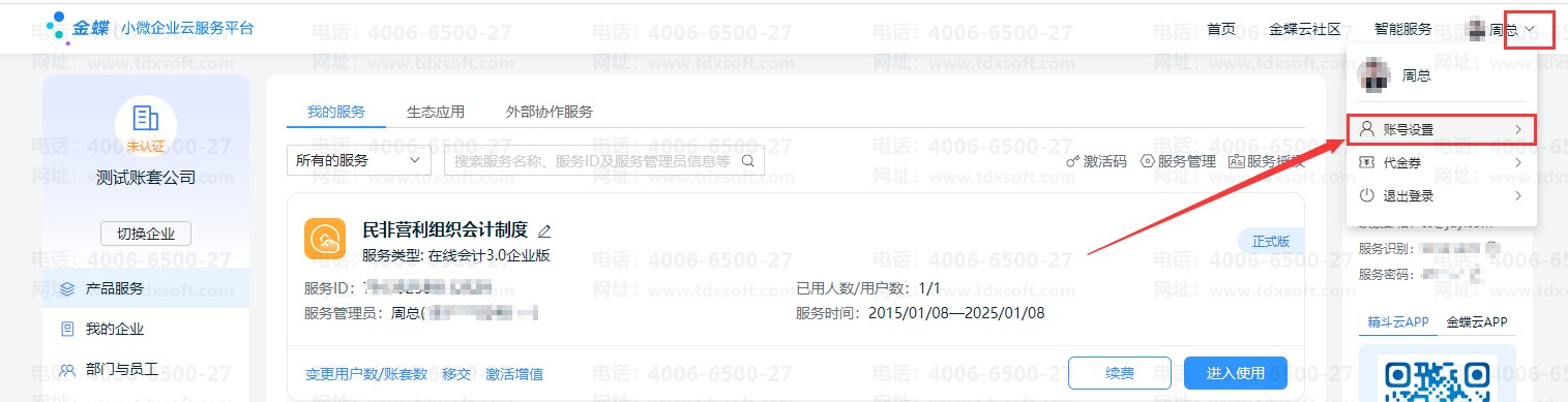 1、登录需修改姓名的账号,精斗云官网(http://www.jdy.com)工作台页面,点击右上角的名字,再点击【账号设置】进入账号设置界面。