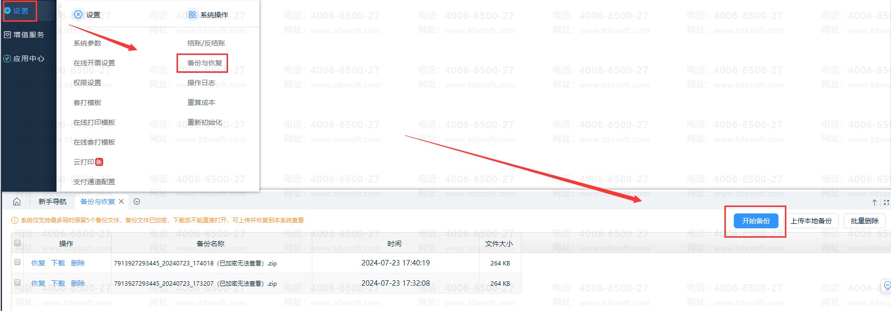 使用账套系统管理员账号,在【设置】-【备份与恢复】中点【开始备份】,可以将当前账套备份完成。
