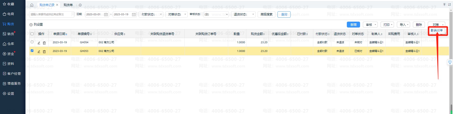 同样打开【购货单-记录】,选择已核对状态的单据,然后点右上角【撤销对单】。