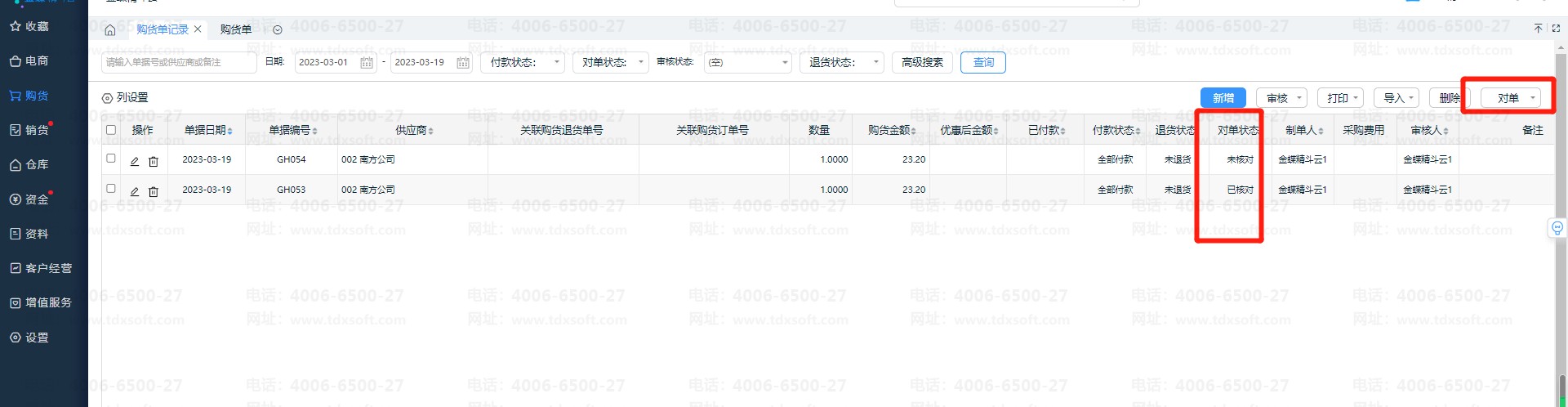 打开【购货单-记录】,选择对应的购货单,点击右上角的【对单】按钮,单据列表的对单状态就会显示【已核对】,标识这张单据是与供应商确认过的。