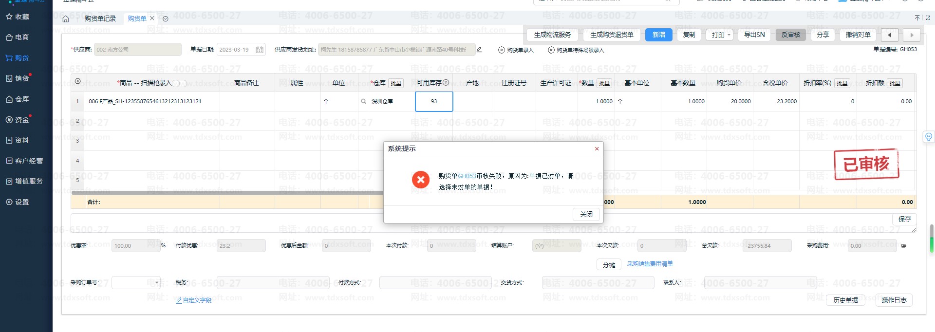注意:已对单的单据不支持反审核(启用审核功能),需要撤销对单后才可进行反审核。