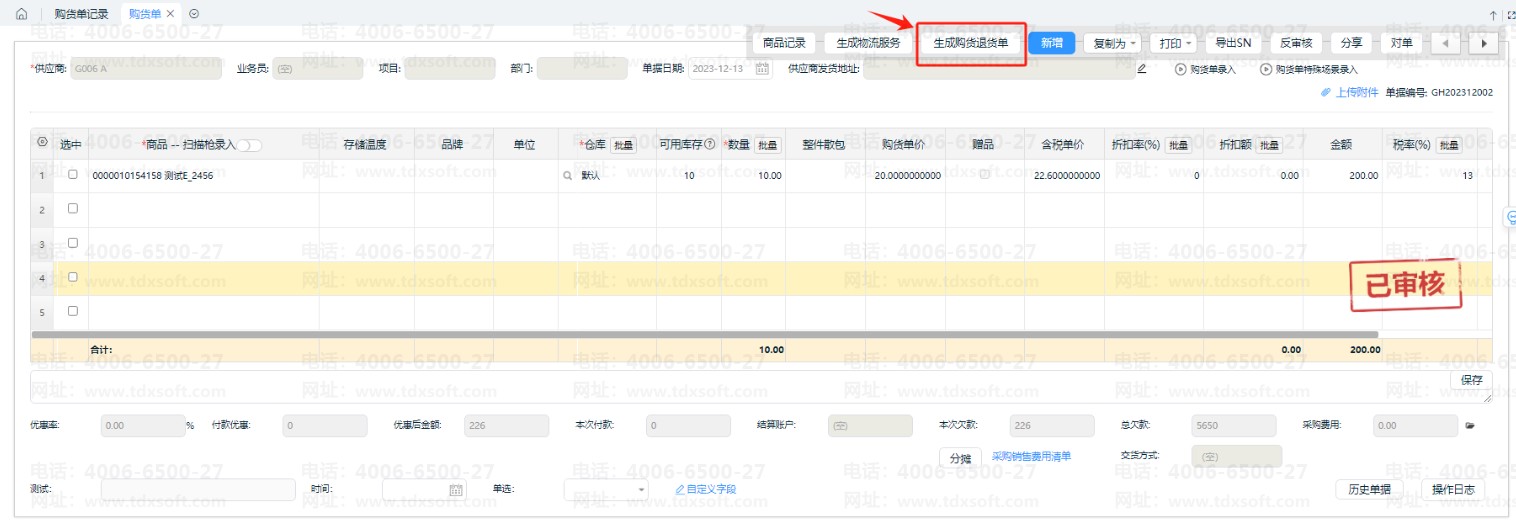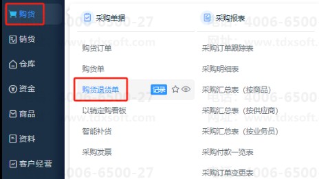 购货退货可按源单退货,直接点击单据上方的【生成购货退货单】生成。或可点击【购货】-【购货退货单】单独录入退货。